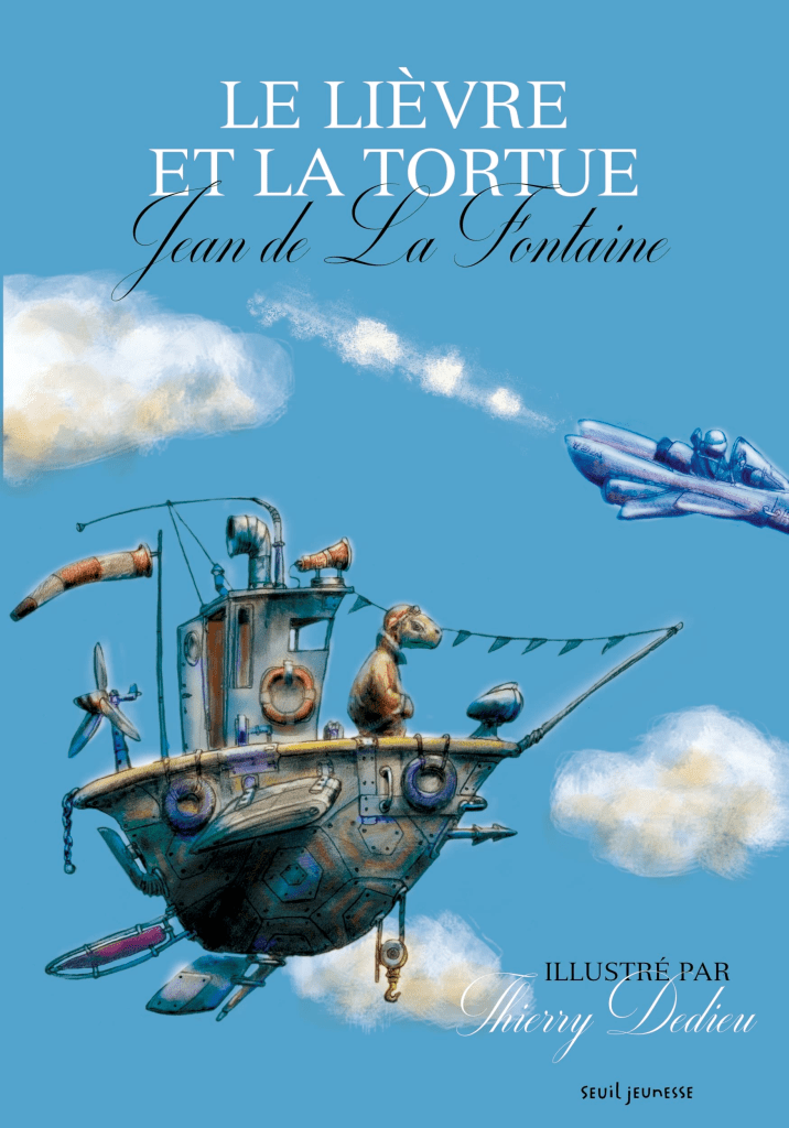 Les fables de La Fontaine continuent à être lues à l’école, à la maison car ces textes nous éclairent toujours avec la même force sur le monde et la nature humaine. Voilà pourquoi Dedieu a transposé Le lièvre et la tortue dans un décor résolument moderne : l’espace. Parce que la morale de ce récit reste d’une grande justesse : « Rien ne sert de courir il faut partir à point »…