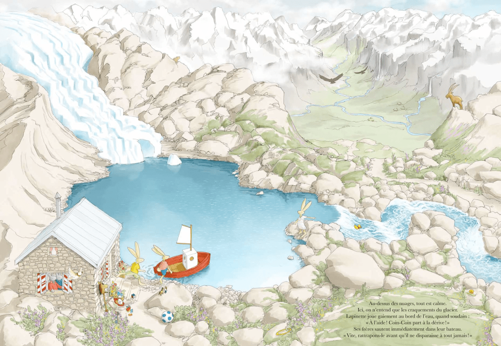 Après Bienvenue, Castor!, l’architecte et illustrateur Magnus Weightman embarque à nouveau le lecteur dans un immense cherche-et-trouve au fil de l’eau : Coin-Coin, le jouet préféré de Lapinette, est emporté par le courant. Vite, les Lapins se lancent à sa poursuite ! À bord de leur bateau, ils descendent le fleuve, depuis sa source dans les montagnes jusqu’à l’océan.